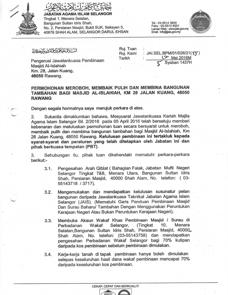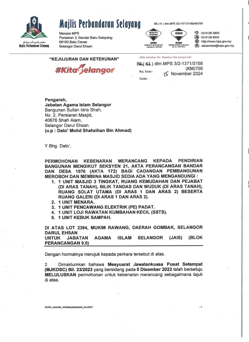Kebenaran Pembinaan Masjid oleh Jabatan Agama Islam Selangor & Majlis Perbandaran Selayang